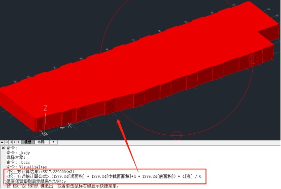 3. 在命令行中输入y并回车确定,可旋转查看实体三维,命令行会显示构件具体的工程量和计算公式。