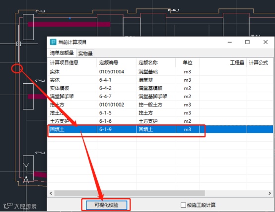 2. 点击工程量菜单栏-可视化校验功能,选择满堂基础构件,在弹出的【当前计算项目】框中点击回填土定额计算项目,再点击【可视化校验】功能,进入实体三维状态。