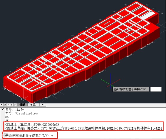 4. 在命令行中输入y并回车,可旋转查看实体三维,命令行会显示构件具体的工程量和计算公式。