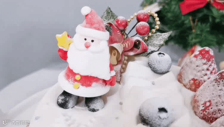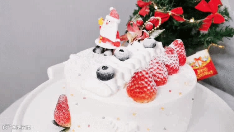 新西兰动物淡奶油/特调草莓奶油/新鲜草莓/新鲜蓝莓/雪花巧克力/彩色糖珠/糖粉/戚风蛋糕胚/圣诞老人插件/铃铛插件
