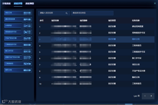 数字平台可嵌入各个项目的建设手续,包括项目立项、建设用地批复、土地供应、用地规划许可证、不动产权证、工程规划许可、房屋不动产权证、工程类报告和临时占地等,并且预设每类手续的责任人和手续办理流程,每类手续完结后,证明文件或附件及时上传,可实现快速办理和追溯。此外,平台内置四色工作预警逻辑(提前、正常、预警、滞后),当出现进度滞后情况,可短信第一时间推送至责任人,透明化办理。
