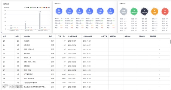 数字平台预设不同业态的全周期进度管控模板(景观绿化、回迁安置、公服设施、产业项目、市政路网、管线迁改、水系治理),实现进度的标准化管理模板。采用进度三级管控制度将节点任务分配到不同的部门、责任人员。列出每条任务的计划开始、计划完成,跟进实际情况,填写实际开始和实际完成时间。此外内置四色工作预警逻辑(提前、正常、预警、滞后),出现预警或滞后,及时推送至责任人,并汇总每个项目、每个节点的完成情况,智能分析,第一时间调度,监控项目进度,力求进度预期。