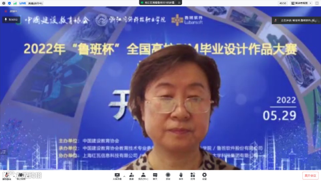 中国建设教育协会教育技术专业委员会主任王静在致辞中为大家介绍了“鲁班杯”大赛的发展历程。作为全国较早面向高校BIM毕业设计开设的大赛,“鲁班杯”经过7年的市场打磨,在赛项设置、大赛形式等方面做到了不断优化,得到了行业的认可,同时也对未来的大赛提出了更高的要求。她强调中国建设教育协会教育技术专业委员会作为中国建设教育协会的二级组织,以建设事业的实际出发,探索建设教育技术的规律和特点,制定研究规划,开展学术研究,进行研究成果的评价和优秀论文的评选。并表示,当下,建筑业正处于深化改革、转型升级和科技进步的重要时期,培养一大批掌握BIM、CIM等信息化技术、具备创新意识的复合型人才提出了更高的要求和迫切需求,希望通过大赛能激发学生的学习兴趣,营造大学生刻苦学习专业知识,勤奋向上的学习氛围,全面提升大学生掌握信息技术的能力,练就过硬专业技能,为加快我国建设行业信息化进程做出积极贡献!