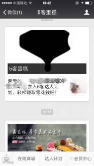 2.进入5客蛋糕微信服务号(sc5kcake)→点击下方“达人计划” →进入微客中心→点击推广商品→进入5客蛋糕微信商城→将微信商城链接分享至朋友圈、好友群、好友→让其自助选择产品;