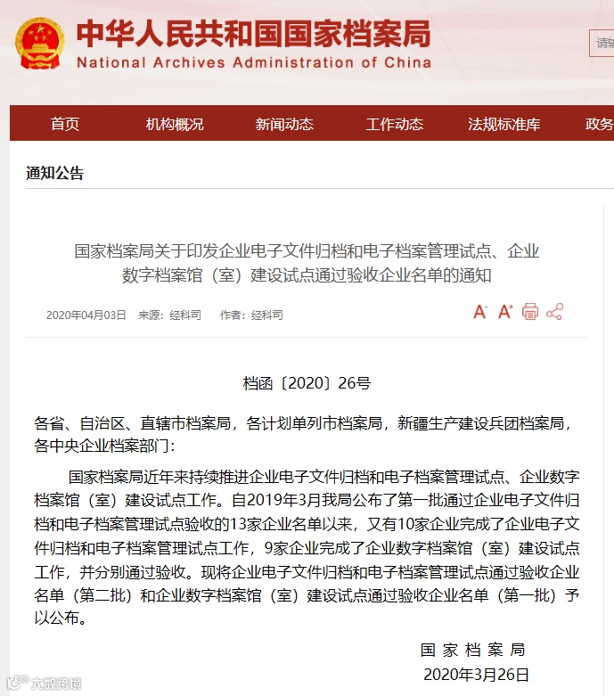 2020年,国家档案局联合国务院办公厅电子政务办公室、国家电子文件管理部际联席会议办公室,选择了30家单位,以电子文件形成与办理、电子文件归档、电子档案移交接收和长期保存为主要任务,进行试点。试点结束之后,将形成一个电子文件单套归档与电子档案单套管理流程,并对经验进行总结推广。