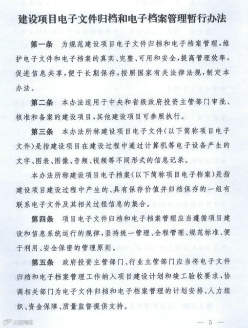 4、《办法》中明确了电子档案的管理要求、技术要求及信息系统功能要求;表达了项目建设过程中的电子档案建设是信息化建设的重要组成单元。