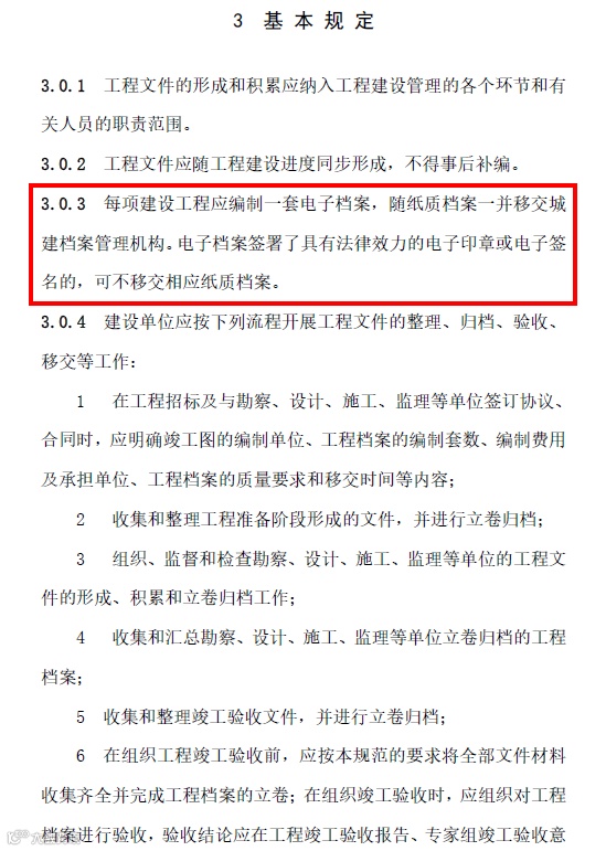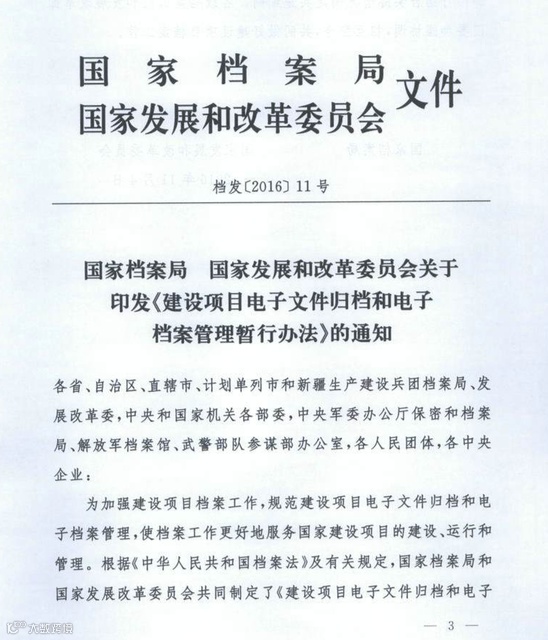 三是新修订的《档案法》,2020年6月20日发布,2021年1月1日起实施。文件专门提到:在来源可靠、程序规范、要素合规的电子档案和传统的档案具有同等的法律效力,为建设项目电子档案的单套制管理提供了法律支撑。
