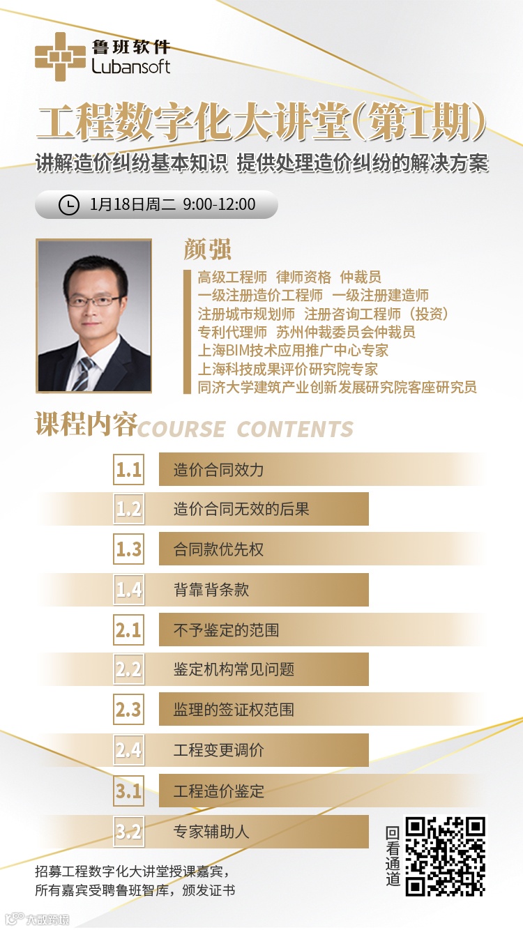 2022年1月18日,由鲁班软件数字造价事业部主办的“工程数字化大讲堂”顺利开讲,第1期由鲁班研究院副院长颜强博士担任主讲嘉宾。颜博士主讲的《工程纠纷与法务》,好评如潮!