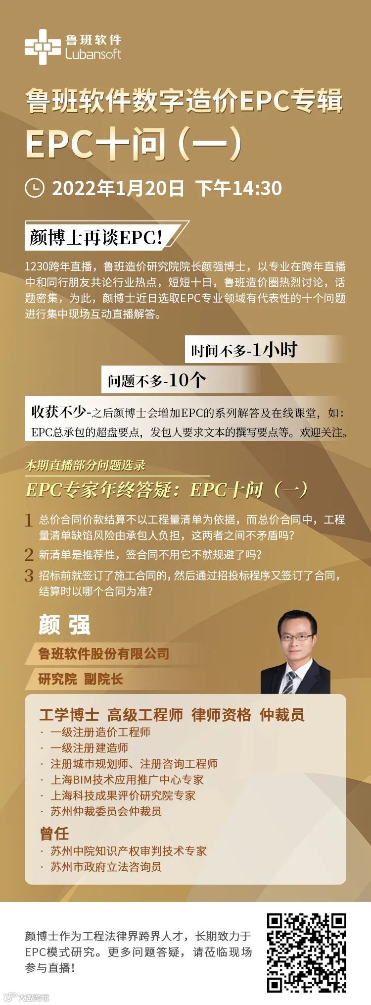 2022年1月20日(周四),颜强博士将为大家带来新的福利——鲁班软件数字造价EPC专辑:EPC十问(一),欢迎大家继续关注。