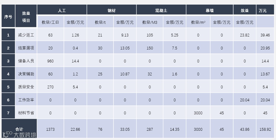 本项目通过图纸问题,预留洞口复核,管线综合深化等方面节约成本,优化资源,机电专业共产生直接经济效益82.62万元,其他专业产生可量化经济效益158.92万元。