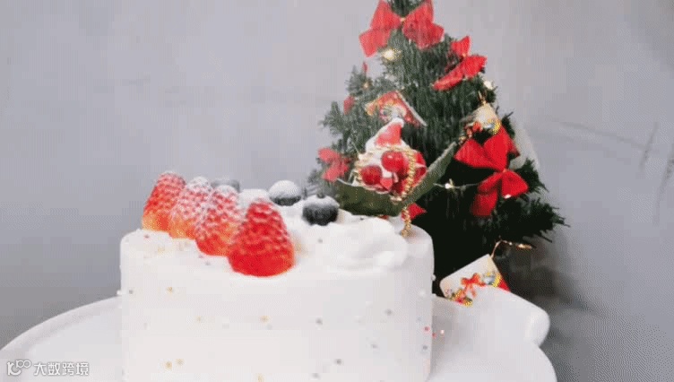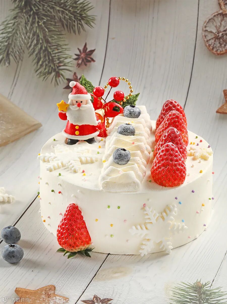 新西兰动物淡奶油/特调草莓奶油/新鲜草莓/新鲜蓝莓/雪花巧克力/彩色糖珠/糖粉/戚风蛋糕胚/圣诞老人插件/铃铛插件