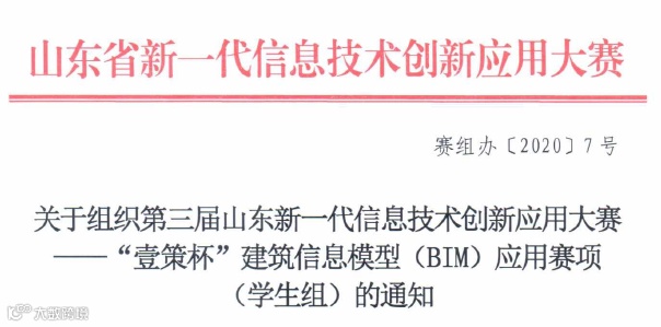 按照《关于举办山东省“技能兴鲁”职业技能大赛——第三届山东新一代信息技术创新应用大赛的通知》(鲁工信软〔2020〕67号)文件精神,现组织“壹策杯”建筑信息模型(BIM)应用赛项(学生组),有关事宜通知如下: