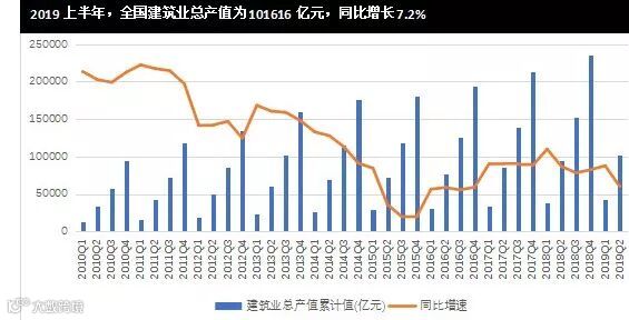 2019年上半年全国建筑业总产值为101616亿元,与上年同期相比增长7.2%,增速较上年同期收窄3.2个百分点,增速放缓;建筑业增加值为27466亿元,比上年同期增长5.5%,其中二季度增加值为16937亿元,同比增长5.1%。全国建筑业房屋建筑施工面积107.5亿平方米,同比增长2.7%。