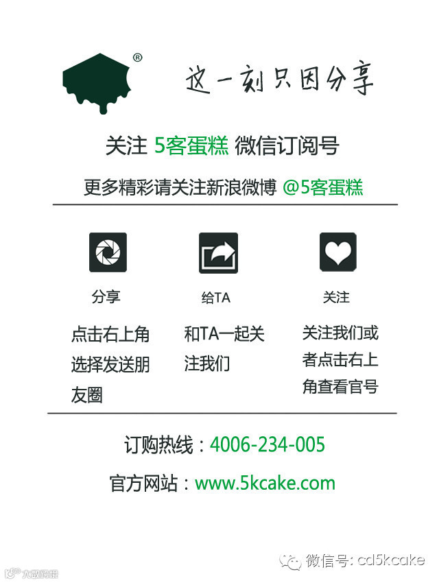 5客CAKE,甜得刚刚好。欧盟级供应链严控食材。订购专线:4006-234-005,提前5小时订购,成都绕城及五郊县城区(新都、温江、郫县、双流、龙泉)免费配送,服务时间:08:30-22:00 送货时间:11:00-21:30。
