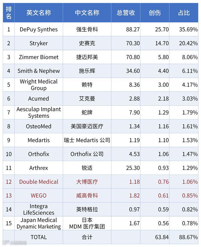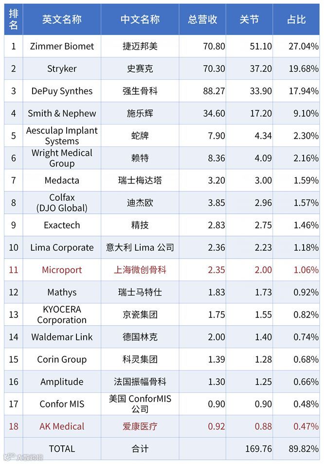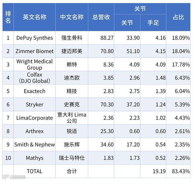 关节领域第一集团由传统四大巨头组成,占据整个市场74%的份额。