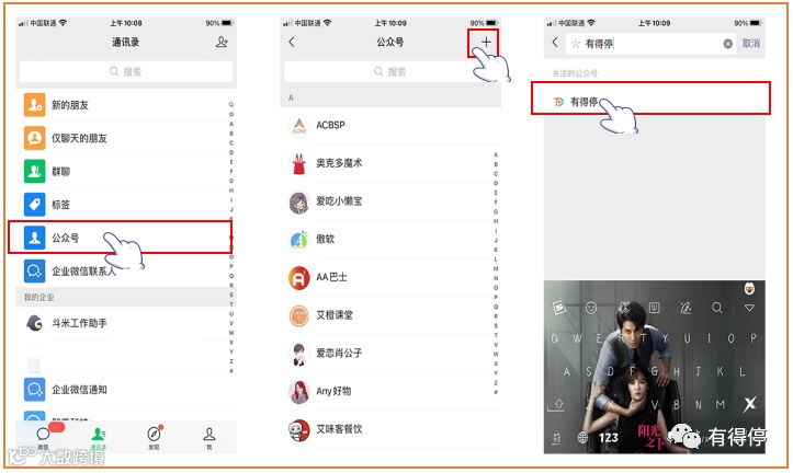 首先打开微信,点到通讯录,点击公众号功能,点击+号,输入“有得停”然后点击“搜索”有得停公众号