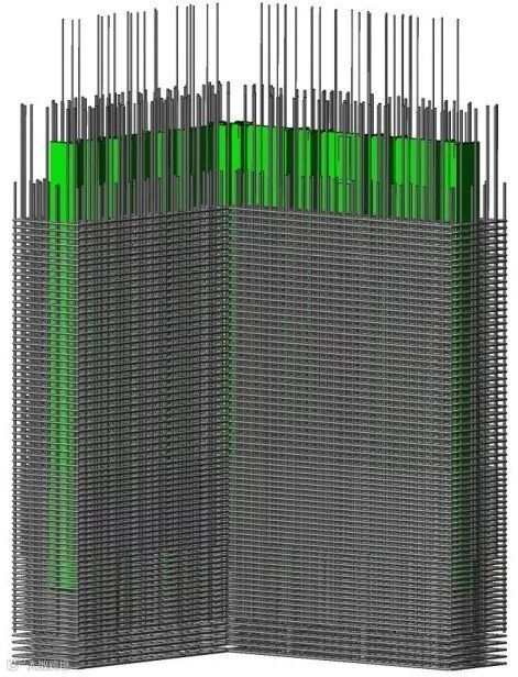利用BIM技术对装配式幕墙进行建模优化,将幕墙优化分割为4.2m*1.5m的单元块,并按位置编码。通过优化方案指导幕墙预制及现场吊装,保证幕墙施工精确化,提高施工效率。