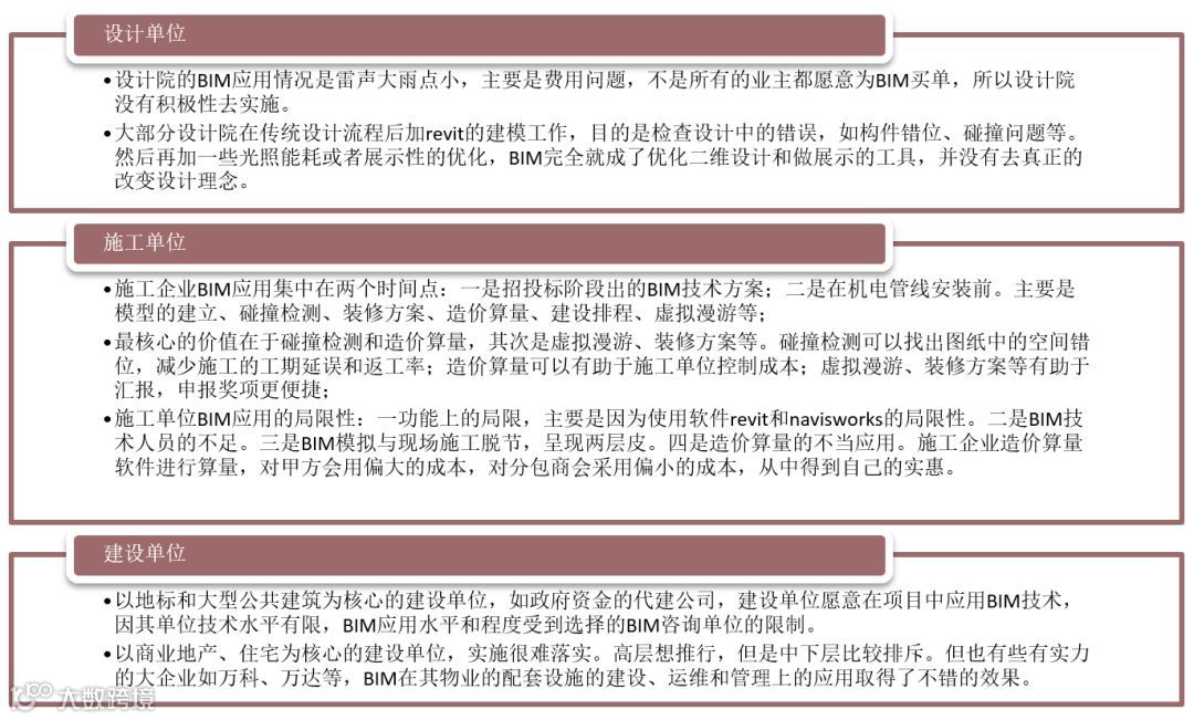 从理论上说,BIM模型提供了贯穿项目始终的数据库,实现了工程项目全生命周期数据的集成与整合,对于提升工程质量、降低造价、控制设计变更、减少返工有重要作用,并能大大降低招标与合同执行的风险。从十年来国内建筑行业的BIM实际应用效果来看,并没有完全达到人们的预期,以下从项目各参与方的角度进行分析: