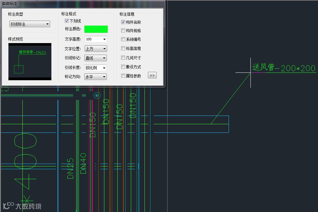 如果您觉得手动标注太慢,没关系,通过整体标记功能,水平和垂直的构件分类直接一键生成,风管、水管、桥架更是进行了拆分,针对不同的构件类别进行相关的标注类型和标注参数的设置,选择您所需要标注的范围,一键搞定,方便快捷。