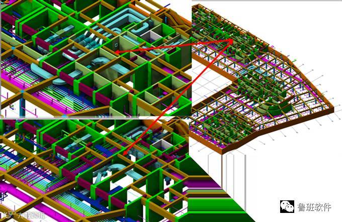 碰撞检查(一次):在鲁班BIM平台中整合各专业BIM模型,进行各专业空间碰撞检查。从而提前解决碰撞问题,节省施工时间,减少返工,避免材料的浪费。