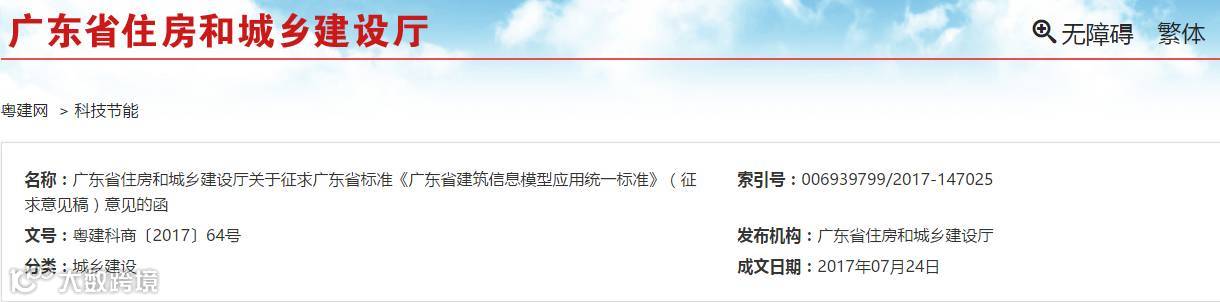 经我厅立项,广东省建筑科学研究院集团股份有限公司、广东省建筑设计研究院等单位组织编制的广东省工程建设标准《广东省建筑信息模型应用统一标准》已形成征求意见稿,现征求你们意见。请各地区、各相关单位从广东建设信息网(政务版)(网址:www.gdcic.gov.cn)下载本标准的征求意见稿,组织研究和提出修改意见,于2017年8月25日前将书面意见反馈至我厅科技信息处。