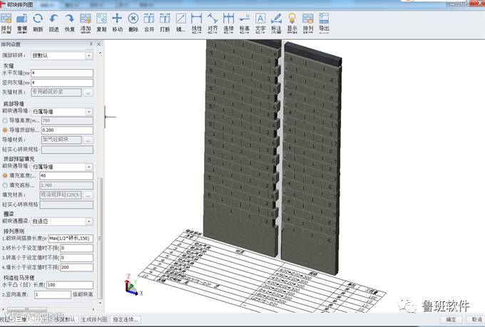 砌体排布。恒大项目地上部分均为高层建筑,标准层数量较多,BIM小组运用鲁班施工的砌体排布功能,按照现场的实际需求,提前将复杂节点位置墙体的排布通过图纸模拟出来,截至目前为止,共计排布5个标准层的墙体,每一面墙体均有对应的墙体编号,且排布图上附有相应砌块的工程量报表,给现场二次结构的施工以及材料的进场计划提供了可靠依据,真正的将BIM技术运用与现场,指导现场施工。