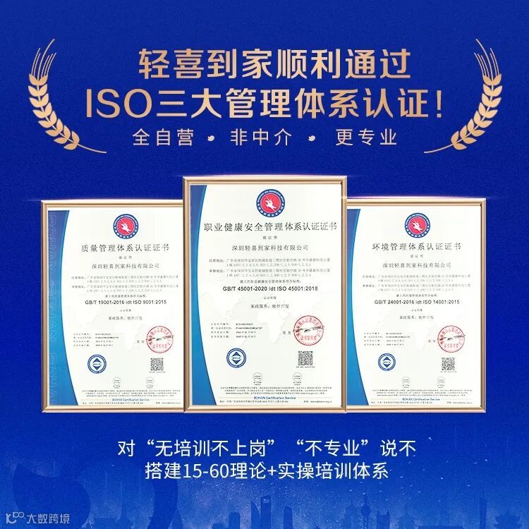 轻喜到家顺利通过ISO三大管理体系认证!荣获ISO 9001质量管理体系认证证书、ISO45001 职业健康安全管理体系认证证书、ISO 14001环境管理体系认证证书;并在深圳市消费者委员会发布的【2022年家政行业消费评价指数】排行榜中荣获【NO.1】