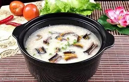 做法:黄鳝洗净后开水焯烫一下,冲洗掉浮沫,后用料酒、盐、胡椒粉腌一会;大米下锅,加水煮至开花后,加入腌制的鳝鱼、姜丝,熟后加盐调味即可。