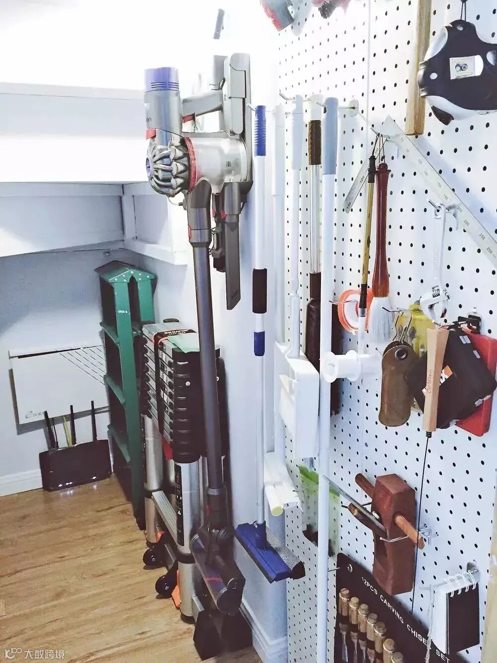 像上图这样做个洞洞板收纳,把拖把扫把挂上去,同时也还显得很有趣