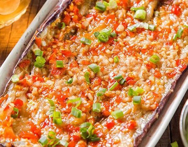 3、用筷子将茄肉分散,淋上蒜蓉酱,放入蒸锅复蒸2分钟,撒上葱花即可。
