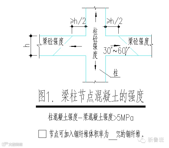 原来在结构总说明中有明确规定:当柱比梁高出一个等级时(柱C40、C35,梁板为C30、C25),采用“高标号砼外扩”的方式施工。
