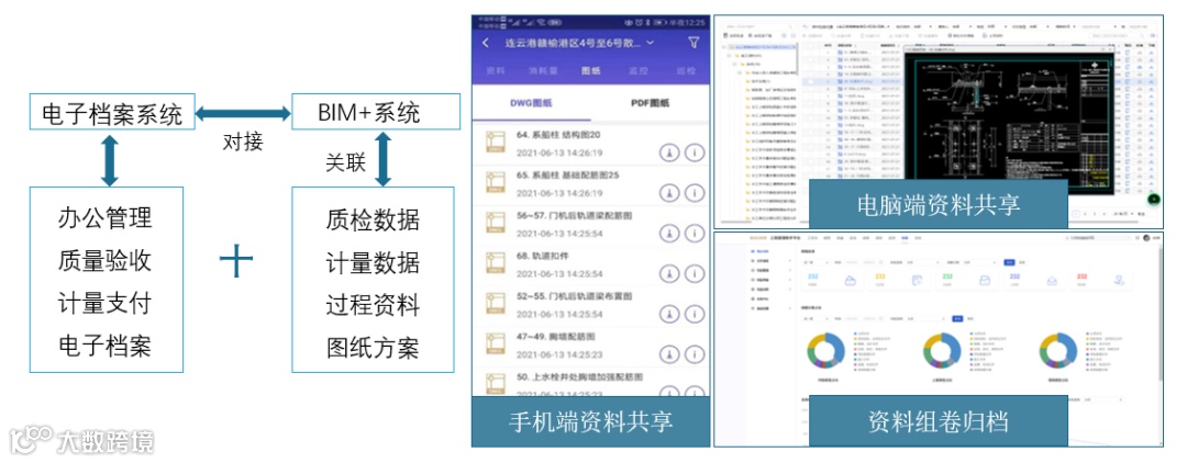 除了根据国标进行竣工电子资料归档之外,项目施工过程中使用平台进行数字资料共享,采用两个端口分别对接品质工程资料以及成本管理数据,如合同清单、产值统计等进行电子归档处理,形成项目自己的数字档案库。同时将集团电子档案系统与BIM管理平台对接,实现了数据资料的贯通、项目资源共享。