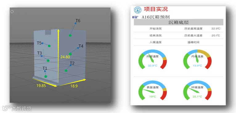 在沉箱分层预制混凝土浇筑的同时,放入温控监测设备,在每层中间区域四角放置,通过温控监测系统将数据传入智慧中心平台,可实现数据实时监测、自动预警、模型定位反查、减少了温度不均产生的沉箱预制质量问题。