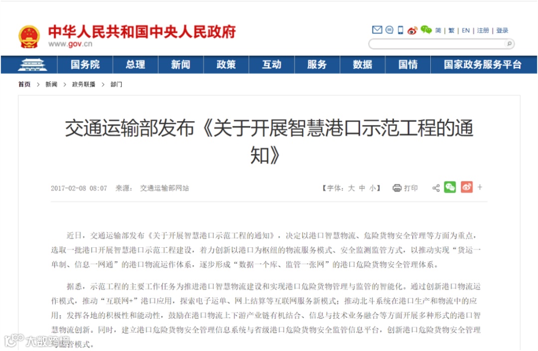 2017年,交通运输部发布《关于开展智慧港口示范工程的通知》,决定以港口智慧物流、危险货物安全管理等方面为重点,选取一批港口开展智慧港口示范工程建设,着力创新以港口为枢纽的物流服务模式、安全监测监管方式,以推动实现“货运一单制、信息一网通”的港口物流运作体系,逐步形成“数据一个库、监管一张网”的港口危险货物安全管理体系。