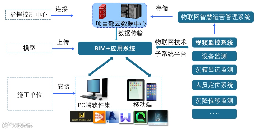 BIM应用软硬件组织架构理念,是通过PC端建模、移动端收集生产信息上传至项目管理平台进行模型关联并分析,通过智慧中心进行数据集成展示与项目施工、运营决策。