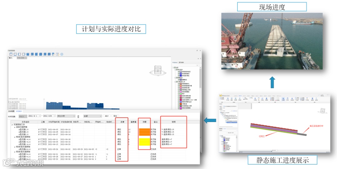 基于BIM管理平台将现场实际施工状态关联模型,项目管理人员通过管理平台即可实时了解到项目施工进展。通过4D进度动态管理,计划进度与实际进度的差异三维动态展示,偏差数据值统计分析,超过预计时间发布预警。根据进度条目进行BIM虚拟建造,展示进度数据,组织进度纠偏会议,优化项目进度的管控。