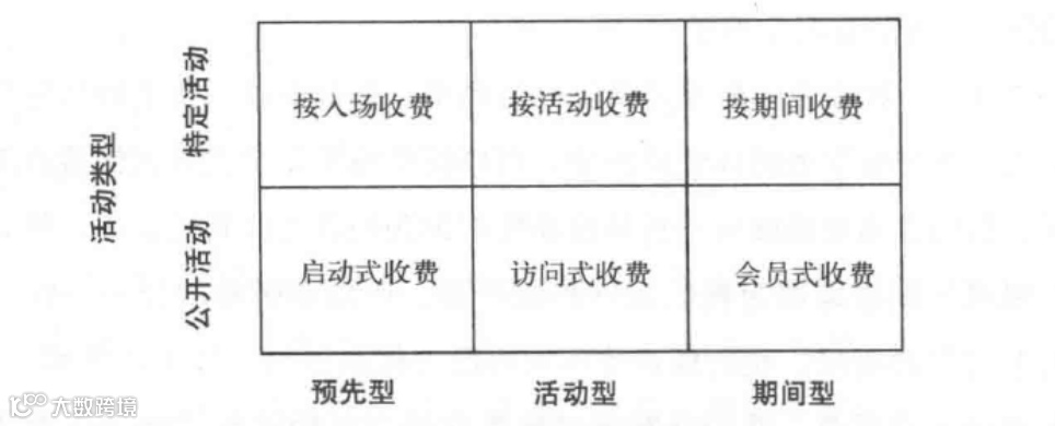 会员式收费:客户被吸收进组织,享受集体体验时收费;参照协会会费、俱乐部年费等;