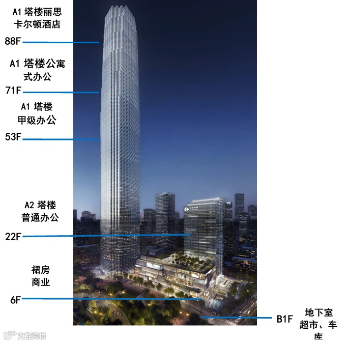绿地山东国际金融中心位于济南中央商务核心区,总建筑面积40.89万㎡,高度428m,地上88层,地下4层。本项目由主塔楼、百米办公塔楼、裙房和地下室四部分构成。