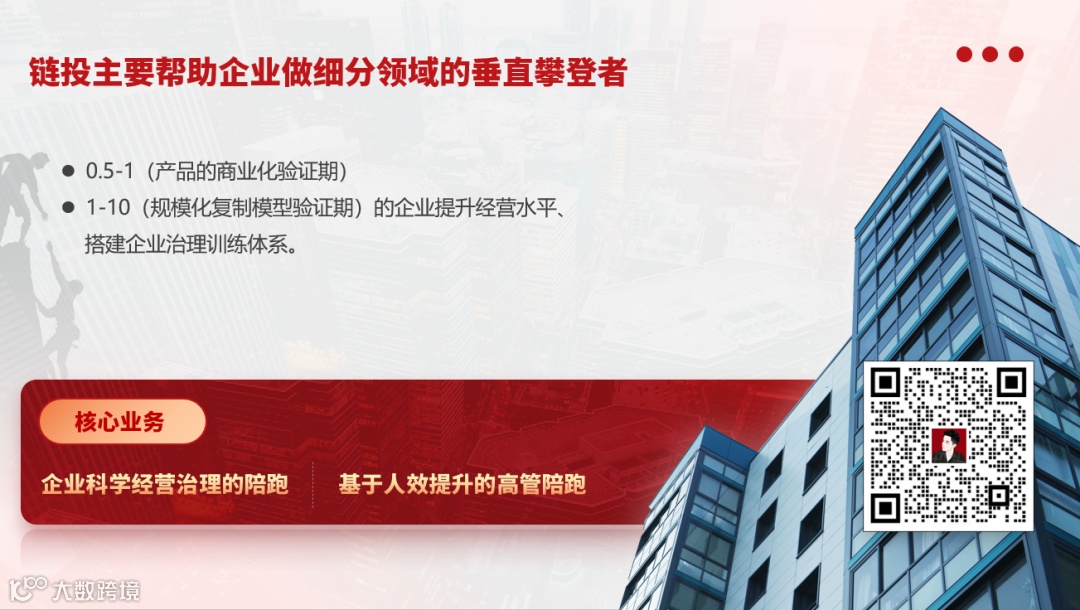帮助创始人和他的核心团队找到内心的「确定性」,让创始团队拥有一致的信念,帮助团队不离不弃,彼此扶持向前;而外部的「确定性」,链投通过链接各种企业发展过程中所需的产业资源,帮助企业突破时间和空间的限制,找到外部世界的「确定性」,让企业顺利渡过脆弱的生死期。