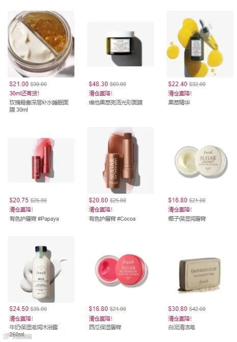 1、Fresh US 现有 清仓大促,精选护肤低至7折