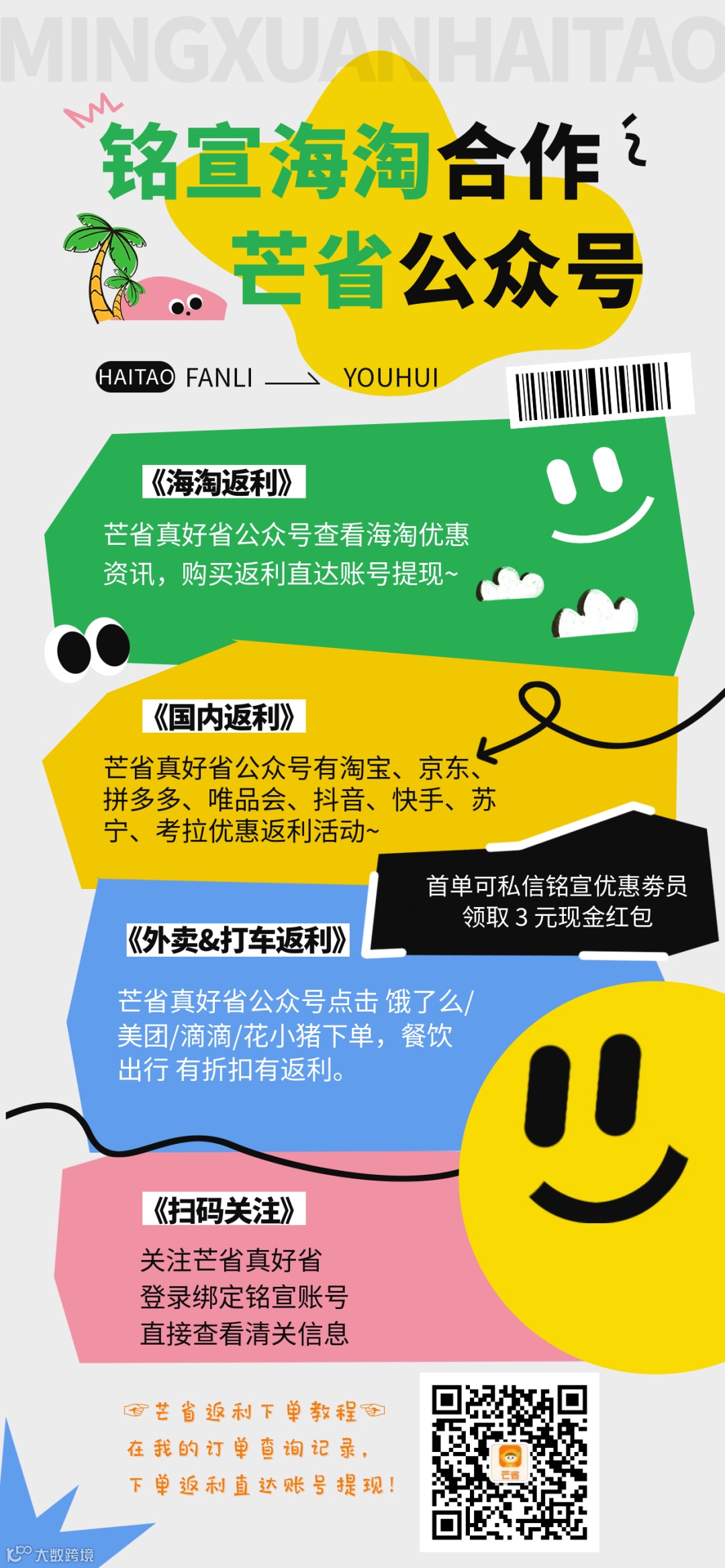 1、铭宣好友首次关注芒省真好省公众号,点击首页,进行铭宣登录,送 10 元铭宣运费优惠劵,内有外卖返现,海淘优惠资讯,国内优惠资讯,各种福利!