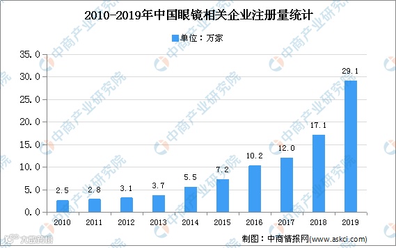 数据显示,2019年全国范围内共有123万家眼镜相关企业,其中在业存续的有96万家。2010年-2019年全国眼镜相关企业注册量逐年攀升,得益于网络电商的发展以及人们对眼镜需求的日益增长,2014年后眼镜行业进入快速发展时期,至2018年,全国范围内眼镜相关企业注册量达17.1万家,是2017年注册量的1.4倍;2019年注册量已达到29.1万家,较2018年增长了70.2%,其中眼镜零售门店就有8万多家。