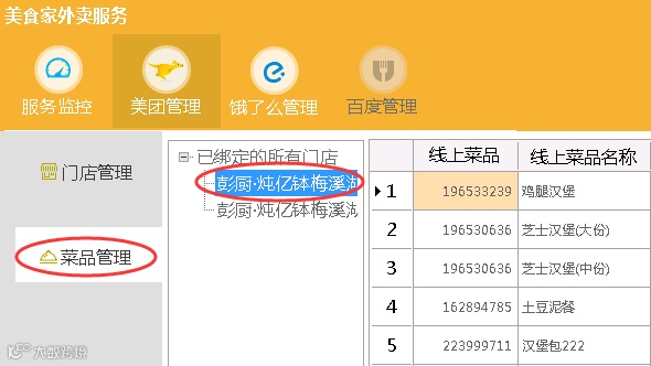 2、菜品管理→已绑定的所有门店,是否有相应的线上门店名称。