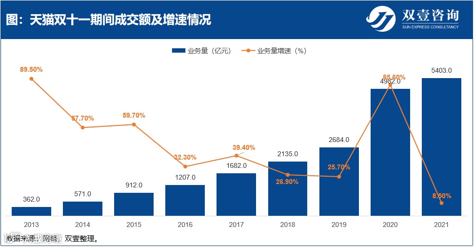 从数据来看,去年淘宝天猫双11成交额5403亿,是天猫史上增速最低的一个双十一。
