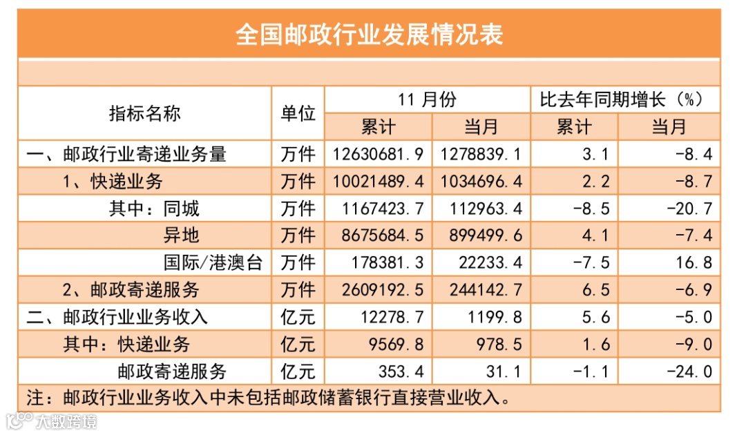 11月份,邮政行业寄递业务量完成127.9亿件,同比下降8.4%。其中,快递业务量完成103.5亿件,同比下降8.7%;邮政寄递服务业务量完成24.4亿件,同比下降6.9%。