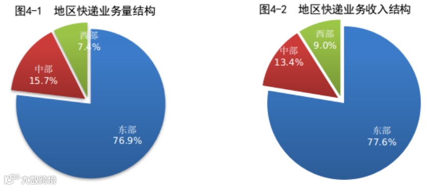 1-11月,东、中、西部地区快递业务量比重分别为76.9%、15.7%和7.4%,业务收入比重分别为77.6%、13.4%和9.0%。与去年同期相比,东部地区快递业务量比重下降1.3个百分点,快递业务收入比重下降0.6个百分点;中部地区快递业务量比重上升1.2个百分点,快递业务收入比重上升0.5个百分点;西部地区快递业务量比重上升0.1个百分点,快递业务收入比重上升0.1个百分点。