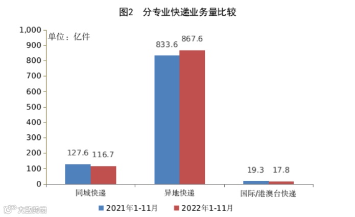 1-11月,同城快递业务量累计完成116.7亿件,同比下降8.5%;异地业务量累计完成867.6亿件,同比增长4.1%;国际/港澳台业务量累计完成17.8亿件,同比下降7.5%。