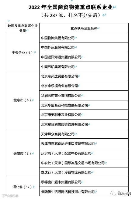 商务部网站公布的2022年全国商贸物流重点联系企业名单,包括中国物流集团有限公司、中国远洋海运集团有限公司、中国五矿集团有限公司、顺丰速运、圆通速递、申通快递、德邦物流、永辉超市等企业。