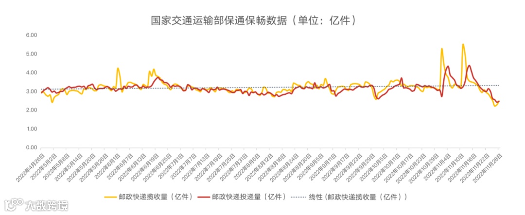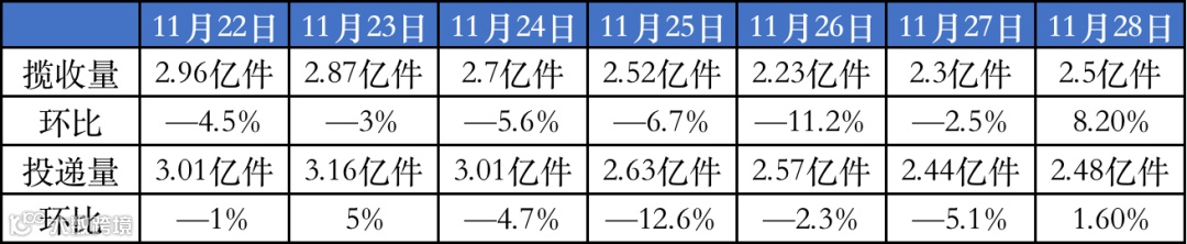 根据交通运输部发布的邮政快递揽投量数据显示,从11月22日开始,就呈现出不断下降态势,甚至一度跌至日均2.23亿件,这个数据甚至低于2年前的快递日均单量。