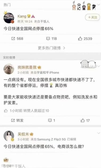 一位网友更表示:全国快递网点停摆65%(注:此数据严重不实,系网友揣测数据)。